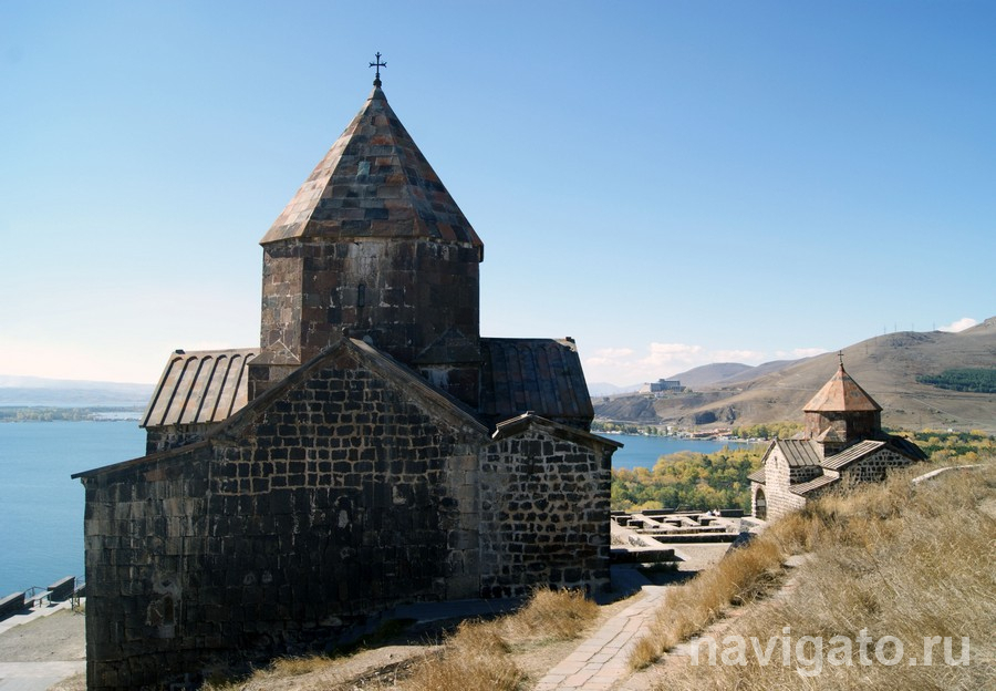 Следующим утром предстояло путешествие к озеру Севан – самому большому на Кавказе. Им армяне очень гордятся. Расположенное на высоте почти 2 км, озеро очаровывает своей красотой и величием. Так как расстояние от Еревана до Севана около 60 км, да и до остальных достопримечательностей, которые планировали посмотреть, было не очень близко, идея взять напрокат автомобиль оказалась весьма здравой. Забронировали машину ещё в Новосибирске и к назначенному времени подъехали к офису прокатной конторы. А через 15 минут уже направлялись в сторону Севана. Впечатление об автомобильном движении в Грузии и Армении хорошо передается одной фразой из старой песни: «Крепко за баранку держись, шофер!». Пешеходы игнорируют светофоры и водителей, водители игнорируют друг друга, пешеходов и зебры. Но выезжаешь за город и расслабляешься. Дороги неплохие, в большинстве с разделительными полосами, виды за окном чудесные. Меньше чем через час уже подъезжали к монастырю Севанаванк, расположенному на северо-западном побережье озера. Монастырь был основан ещё в IX веке принцессой Мириам (дочь армянского царя Ашота Багратуни). Его стены помнят не только молитвы монахов, но и битвы с иноземными захватчиками, в которых принимали участие и священнослужители! Сейчас здесь, кроме монастыря, находится духовная семинария.