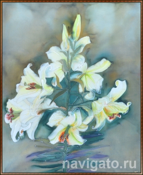 Именно алтайское лето заряжает энергией ее творчество. В этих работах не только буйство красок и оттенков дачного цветника. Несмотря на условность изображения, кажется, что цветы на картинах живут, излучая внутренний свет. Отчасти это объясняется свойствами самого материала – белого, полупрозрачного шелка и легкими переливчатыми тонировками анилиновых красок. Рука мастера, крепнущая год от года, привносит в простые сюжеты неуловимое ощущение «присутствия в кадре». Ловлю себя на мысли, что будто бы сам вместе с художником провожу эти линии абрисов.