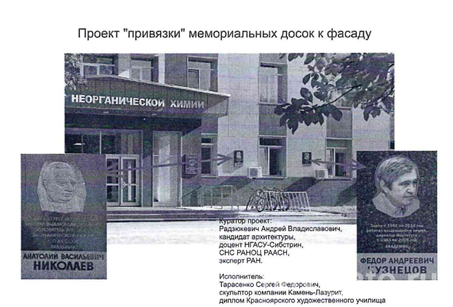С таким предложением в городской департамент культуры, спорта и молодёжной политики обратились представители ИНХ СО РАН. Мемориальную доску хотят выполнить в чёрно-белом цвете на граните. Помимо портрета учёного, там будет надпись: «Академик Фёдор Андреевич Кузнецов. Здесь с 1961 по 2014 год работал выдающийся химик, директор Института с 1983 по 2005 год».