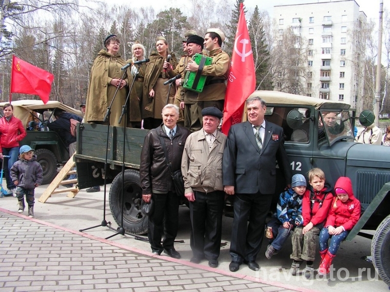 К главному входу Дома ученых лихо заворачивает колонна ретроавтомобилей с развевающимися на ветру красными победными флагами: легендарный грузовик ЗиС-5 (полуторка) и такие знакомые нам по военным фильмам командирские «легковушки» ГАЗ-67Б и «Виллис». Аплодисментами приветствуют люди стоящих в кузове грузовика солистов «фронтовой агитбригады» – участников технического и военно-исторического клуба «Сибирская гвардия» под руководством Владимира Жданова (г. Новосибирск).