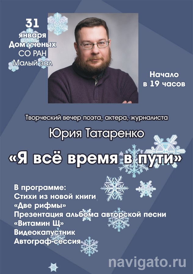 31 января в Малом зале Дома учёных СО РАН состоится сольный концерт поэта, актёра, драматурга и журналиста Юрия ТАТАРЕНКО.