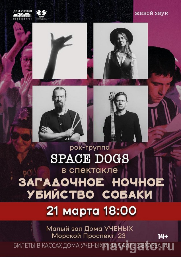 21 марта (суббота) в 18 часов – «Загадочное ночное убийство собаки» (14+) по книге Марка Хэддона. Это психологический детектив про космически талантливого парня из британской спецшколы, который пытается адаптироваться к нормам общества. В спектакле много живой музыки, а английские песни исполняет рок-группа Space dogs.