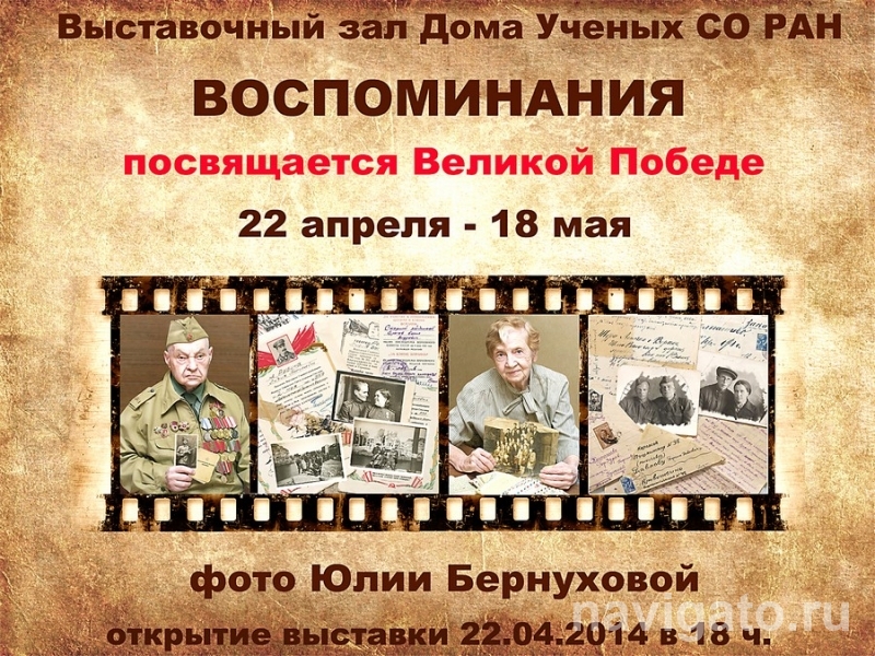 22 апреля в 18 часов в Выставочном зале Дома ученых СО РАН откроется выставка «Воспоминания». На ней будут представлены портреты участников Великой Отечественной войны, тружеников тыла, блокадников.