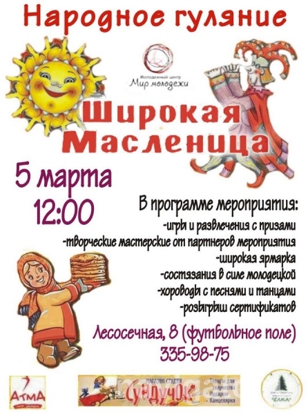 МЦ «Мир молодёжи» 5 марта организует народное гуляние «Широкая Масленица». В программе: игры и развлечения с призами, творческие мастерские от партнёров мероприятия, широкая ярмарка, состязания в силе молодецкой, хороводы с песнями и танцами, розыгрыш сертификатов.