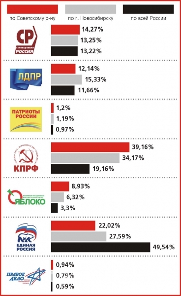 Предварительные итоги выборов депутатов Государственной Думы Федерального собрания Российской Федерации VI созыва от 4 декабря 2011 года по Советскому району, в целом по Новосибирску и по всей России, %.