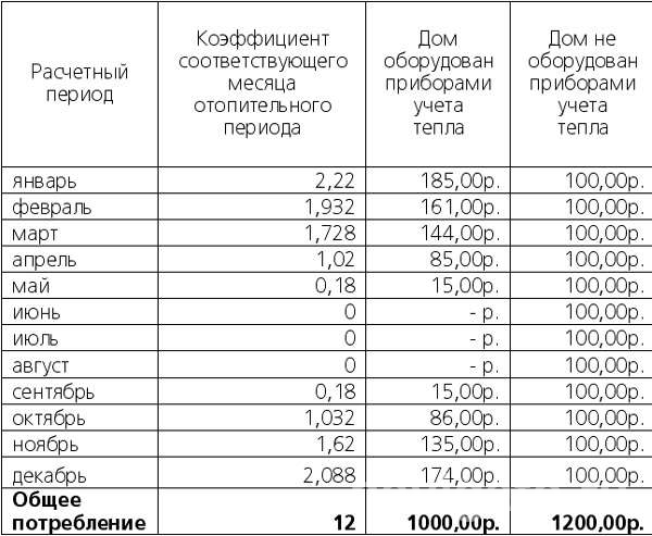 Однако распределение оплаты зависит от месяца отопительного сезона. В ноябре, декабре, январе, феврале и марте оплата тепловой энергии по приборам учета, как правило, выше, чем оплата по расчетному методу. Примерный расчет оплаты за тепло в доме без прибора учета и в доме, оборудованном прибором учета, наглядно иллюстрирует следующая таблица: