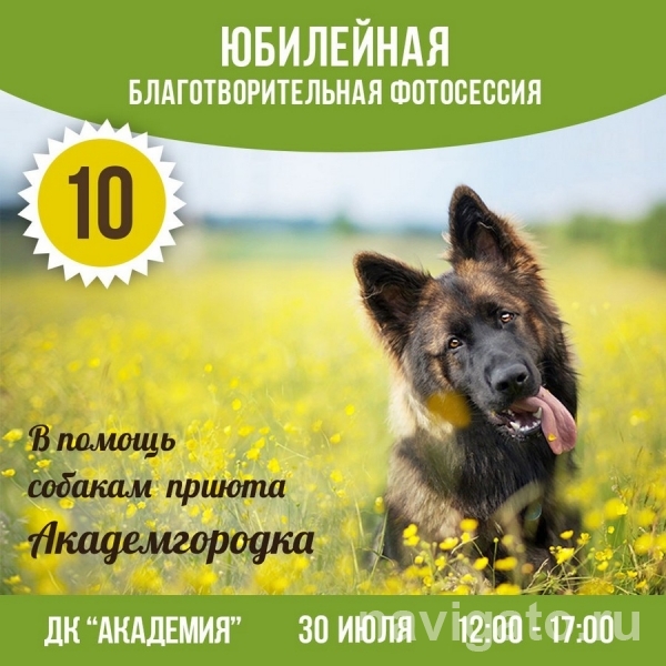 С 12 до 17 часов 30 июля в сквере Победы (около ДК «Академия») проводится 10-я благотворительная фотосессия с породистыми собаками и другими животными в пользу приюта Академгородка. Это будет грандиозный праздник с пушистыми (и не только) фотомоделями. Сфотографировавшись за небольшую плату, вы поможете собакам, оставшимся без дома. Приходите!