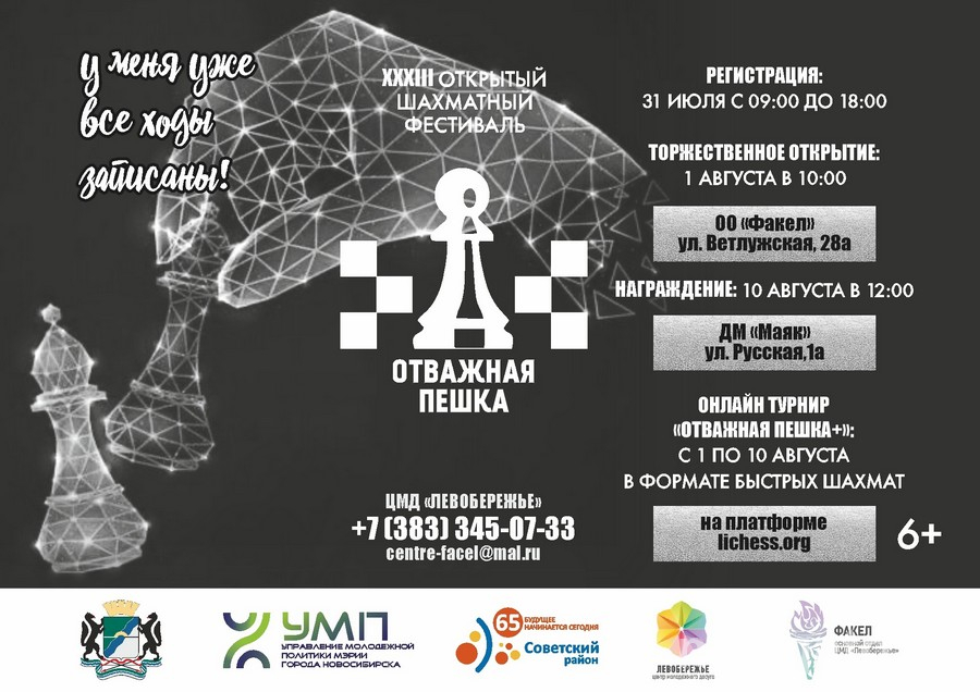 Очные встречи будут проходить с 1 по 9 августа. Для участия  предварительную заявку необходимо прислать до 20 июля 2023 года по адресу: Россия, 630056, Новосибирск-56, ул. Ветлужская, 28а, фестиваль «Отважная пешка» или на одну из электронных почт: centre-facel@mail.ru, khanin52@yandex.ru.