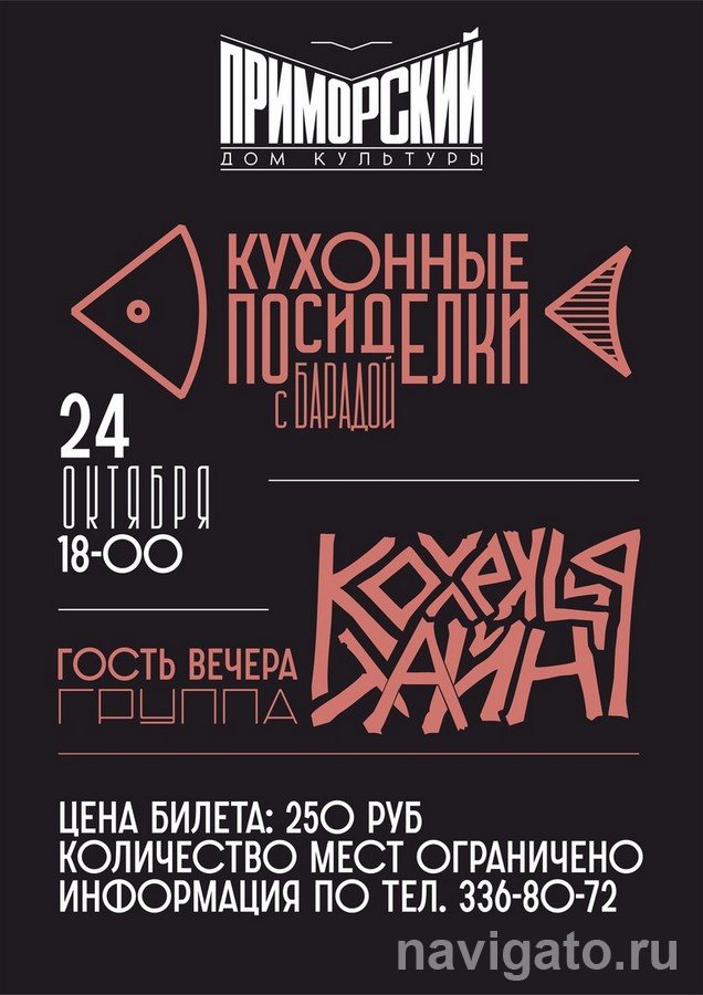 24 октября в 18 часов в ДК «Приморский» стартует новый проект «Кухонные посиделки с БарАдой». В пространстве, похожем на квартиру времён СССР, будут проходить музыкальные встречи. Первая – с группой «Коллекция Тайн». Количество мест ограничено. Купить или забронировать билеты можно по тел. 336-80-72. Цена 250 руб. Сокращённый вариант квартирника позже появится в соцсетях ДК «Приморский».