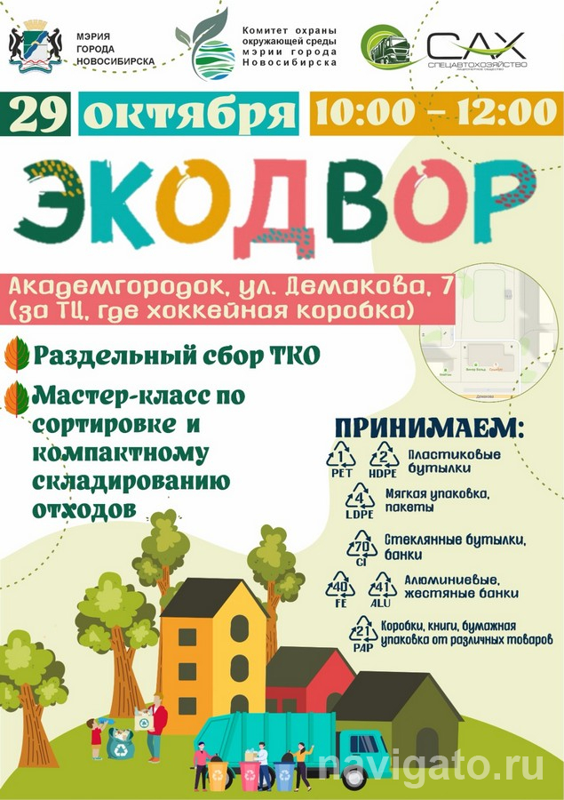 Акция «Экодвор» пройдёт 29 октября в м-не Щ. Экомобиль будет дежурить с 10 до 12 часов за ТЦ по ул. Демакова, 7, у хоккейной коробки. Горожане смогут сдать пластиковую, стеклянную, алюминиевую и жестяную тару, мягкую упаковку и пакеты, макулатуру. Собранные отходы экомобиль отвезёт на переработку. Также для участников проведут мастер-класс по сортировке и компактному складированию отходов.