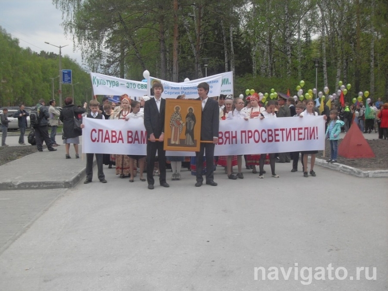 Началось шествие у Дома ученых, ребята шли под музыку по улице Ильича с шарами и плакатами, прославляющими великий могучий русский язык и родную культуру. Ученики Православной гимназии во имя Преподобного Сергия Радонежского возглавляли колонны школьников, двое выпускников несли в руках икону с изображением основоположников славянской письменности равноапостольных братьев Кирилла и Мефодия. Ведь именно этим первоучителям мы обязаны обретением такого ценнейшего дара, как письменность.