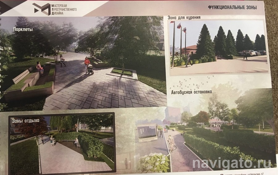 Проект довольно солидный для данной территории. Здесь и зоны отдыха с лавочками и беседками, и детская площадка, и площадка для отдыха молодёжи. Предусмотрена парковка на 45 машиномест, 30 из которых относятся к так называемой экопарковке: автомобили стоят на выращенном по специальной технологии газоне. За территорией будут ухаживать садовники, а охранники – следить, чтобы в вечернее время не собирались пьяные или шумные компании.