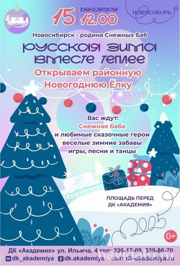 В 12.00 на площади перед ДК «Академия» вас будут ждать Снежная Баба и любимые сказочные герои. В праздничной программе – весёлые зимние забавы, игры, песни и танцы. Подробности по телефонам 330-17-09, 330-86-70.