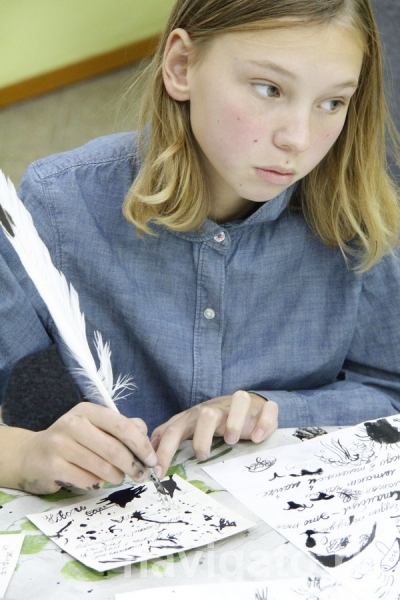 На листе появляются буквы – летящие, размашистые, чем-то похожие на японские иероглифы. Рядом со мной сосредоточенно скрипят перьями юные поэты из литературной студии Центра детского творчества. Они иллюстрируют свои стихи. А проводит мастер-класс художник Елена Юдина.