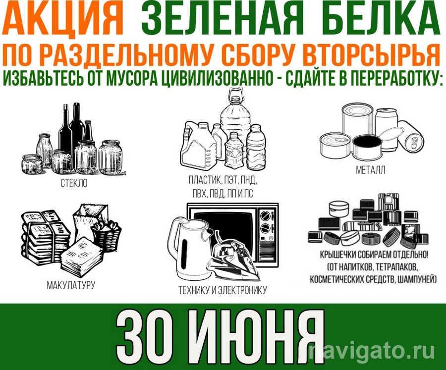 Жителям предоставляется возможность сдать вторсырьё 30 июня (суббота). Принимаются бумага (тщательно перевязанная), пластиковые отходы (маркировка 1, 2, 3, 4, 5, 6, обязательно чистые, сжатые и компактно сложенные по маркировкам), электронный лом, стекло (не битое и упакованное), металлы (алюминий и консервная жесть). Расписание работы точек: