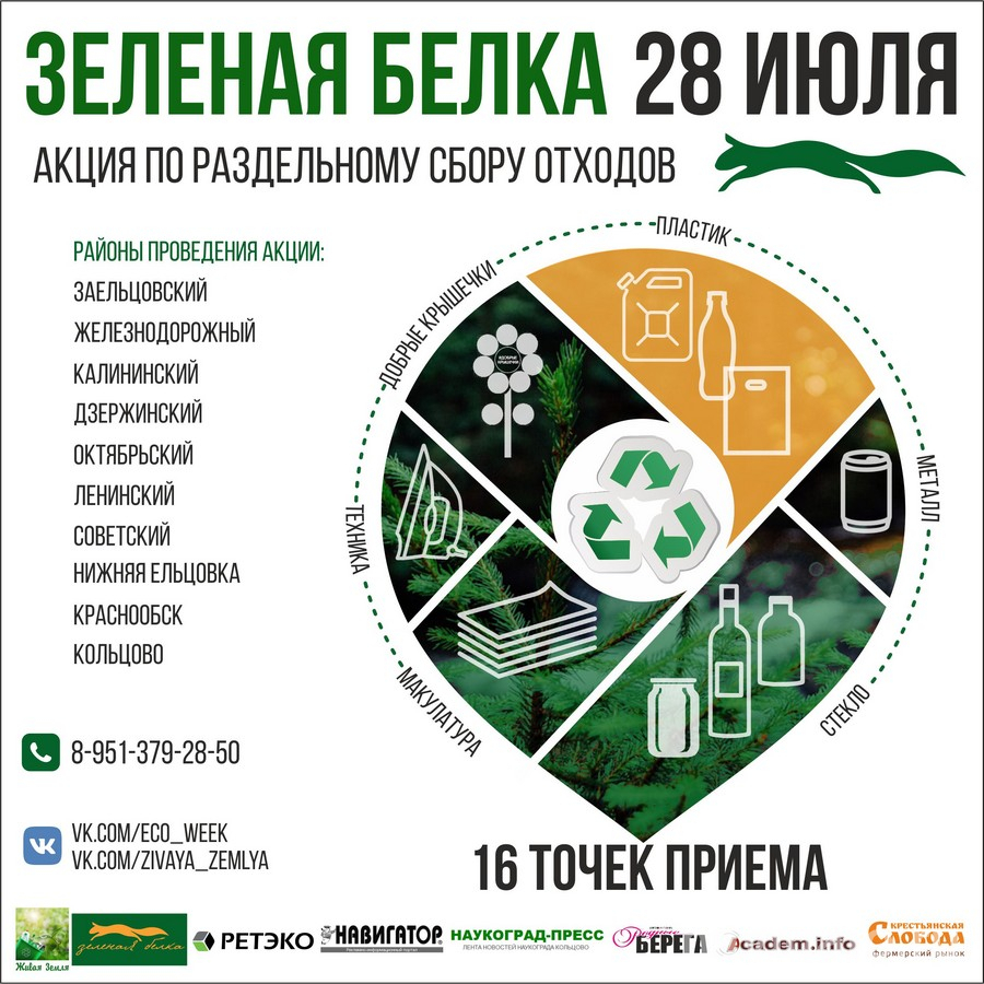 Жители могут сдать вторсырьё 28 июля (суббота). Принимаются бумага (тщательно перевязанная), пластиковые отходы (маркировки 1, 2, 4, 5, 6, обязательно чистые, сжатые и компактно сложенные по маркировкам), электронный лом, стекло (не битое и упакованное), металлы (алюминий и консервная жесть). Расписание работы точек: