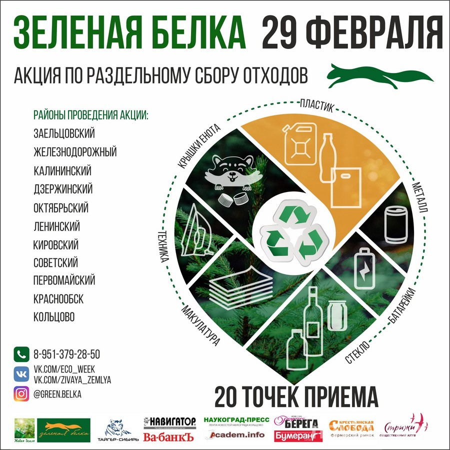 29 февраля (суббота) жителям предоставляется возможность бесплатно сдать вторсырьё. Принимаются макулатура (упакованная), пластиковые отходы (с маркировками 1, 2, 4, 5, 6, указанными в треугольнике, обязательно чистые и компактно сложенные), электронный лом (бытовая, компьютерная техника), стекло (не битое и упакованное), металлы (алюминий и консервная жесть), батарейки. Расписание работы точек: