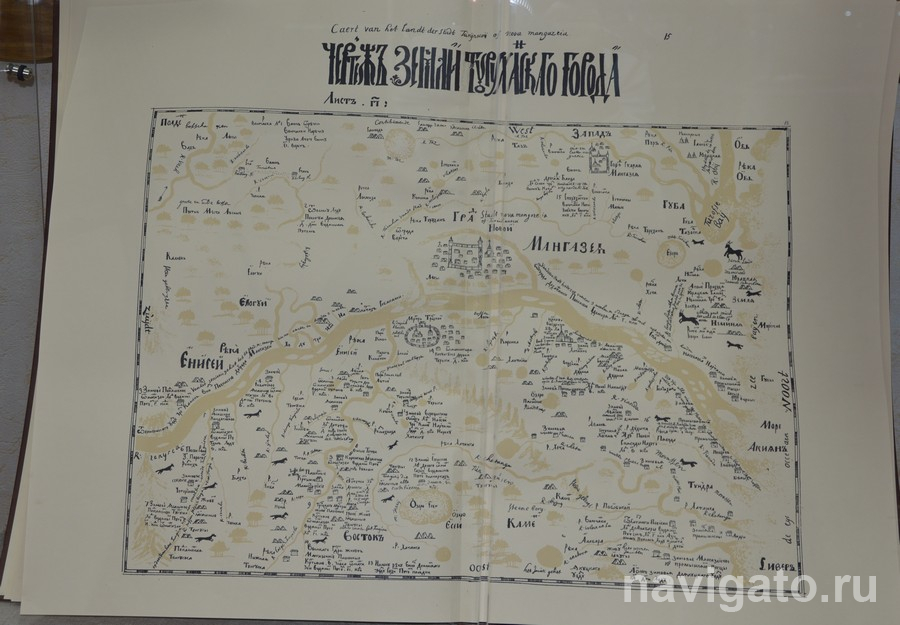 Главный экспонат – масштабная копия «Чертежной книги Сибири» Семена Ремезова, где отображено 7000 географических названий, густая сеть рек, могучие леса и даже животные.