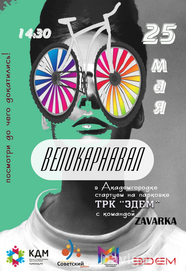 Четвёртый раз МЦ «Мир молодёжи» проводит Велокарнавал Академгородка. Костюмированный кольцевой проезд стартует 25 мая в 15 часов от ТРК «Эдем» (ул. Кутателадзе, 4/4, регистрация в 14.30). К участию приглашаются все желающие. Дети младше 14 лет – в сопровождении тренера или родителей. После проезда состоится онлайн-конкурс на лучший костюм. Подробности в группе vk.com/velocarnaval.