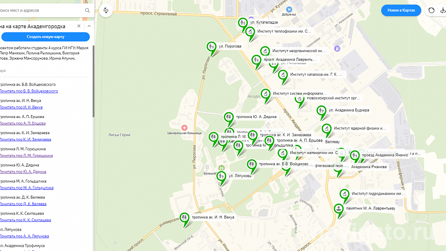 Интерактивную карту достопримечательностей создали четверокурсники, сообщает пресс-служба НГУ. Изначально проект задумывался как приложение для смартфона, но из-за технических сложностей формат был изменён, и на платформе Яндекс.Карт появилась новая интерактивная схема, на которой расставлены метки с местами, названными в честь учёных. При выборе точки совершается переход на небольшой лонгрид, посвящённый конкретному деятелю науки: кто, чем знаменит, интересные биографические факты и воспоминания современников.