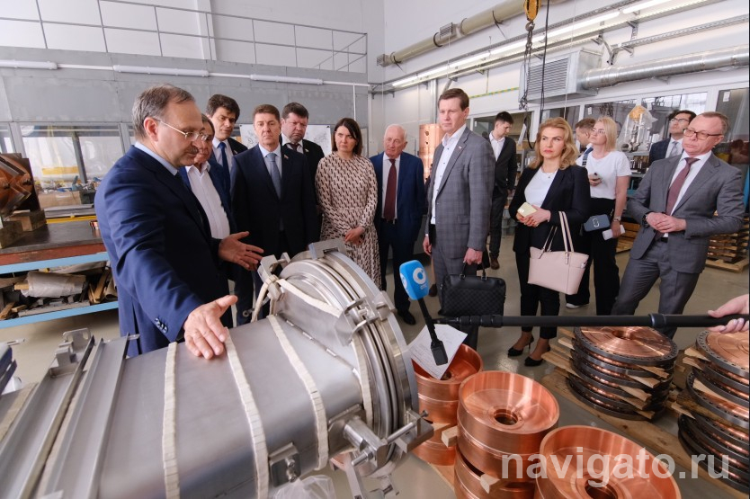 Делегация посетила экспериментальное производство Института ядерной физики СО РАН. Накануне в НИИ началась сборка первых сегментов синхротрона-бустера для СКИФа. Это важнейший элемент будущего ускорительного комплекса. Получение первого электронного пучка в условиях радиационно-защищённого зала ИЯФ СО РАН запланировано на конец июня – начало июля. Уникальное оборудование ускорительного комплекса обойдётся в 12,5 млрд рублей.