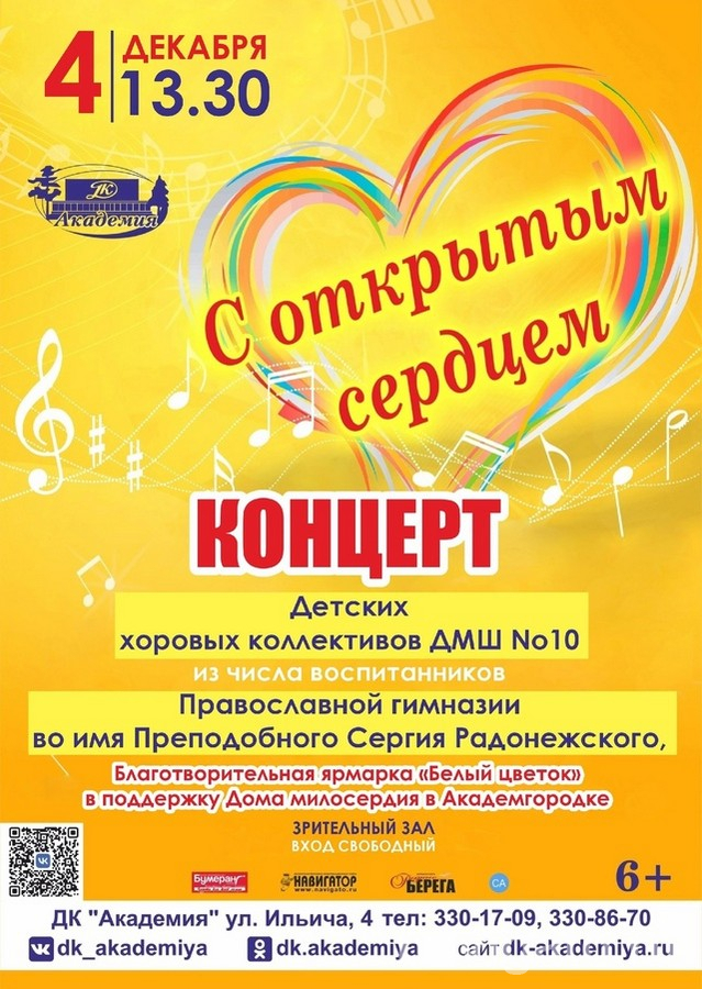 ДК «Академия» (ул. Ильича, 4) 4 декабря в 13.30 организует концерт «От сердца к сердцу», на котором выступят детские хоровые коллективы ДМШ №10, затем начнётся выставка-ярмарка в поддержку Дома милосердия, шахматно-шашечный турнир и встреча в клубе общения инвалидов «Надежда».