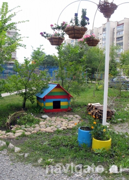 Рецепт успеха жителей этого дома несложен: неравнодушие плюс взаимопонимание и добрососедские отношения. Общий девиз озеленителей – «Ближе к природе». Малые формы, изображающие птиц, органично вписываются в общий колорит клумб, газонов и рабаток. Белый аист уютно устроился в высоком цветочном гнезде, а на коротко остриженном клене притаился филин, стерегущий добычу. Кроме него, в сравнении с прошлым годом, появилась тут разноцветная собачья конура с симпатичным плюшевым обитателем, высажены новые деревья и кустарники. Здесь давно отошли от использования старых автопокрышек, отдавая предпочтение профессионально выполненным малым формам для сада, сделанным из экологически чистых материалов.
