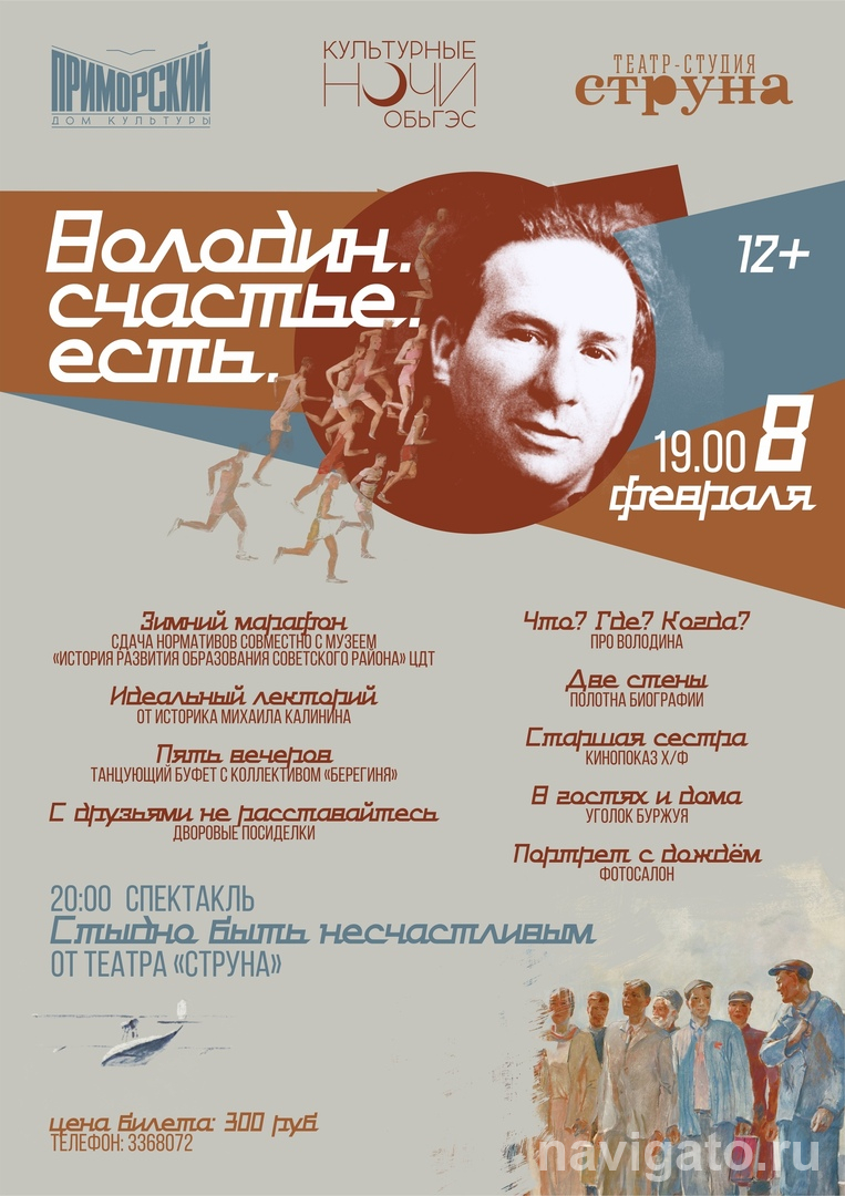 Очередное атмосферное действо проекта «Культурные ночи на ОбьГЭС» состоится 8 февраля с 19 до 22 часов в ДК «Приморский» (ул. Молодости, 15). На этот раз вечер посвящается драматургу и сценаристу Александру Володину.