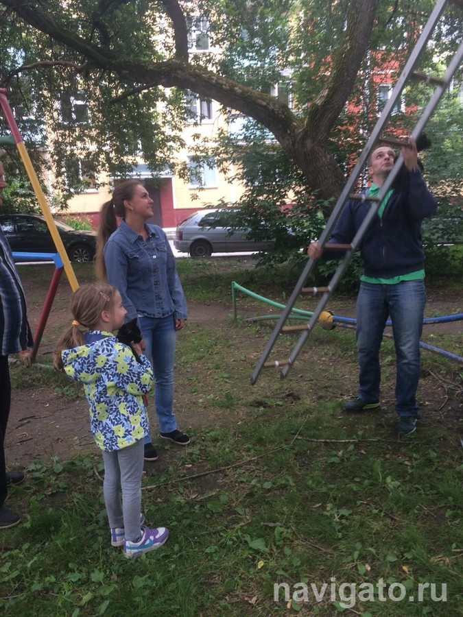 24-го и утром 25-го июля мы обзванивали все службы. Откликнулась на нашу беду лишь диспетчер ПСЧ-8 Екатерина Навальная, которая приехала к нам во двор вместе с Дмитрием Степановым-Щедровым. Они привезли с собой телескопическую лестницу, с помощью которой молодой человек смело и уверенно добрался до верхних ветвей дерева и буквально за 15 минут снял котёнка. Герою аплодировали наблюдавшие за происходящим жители.