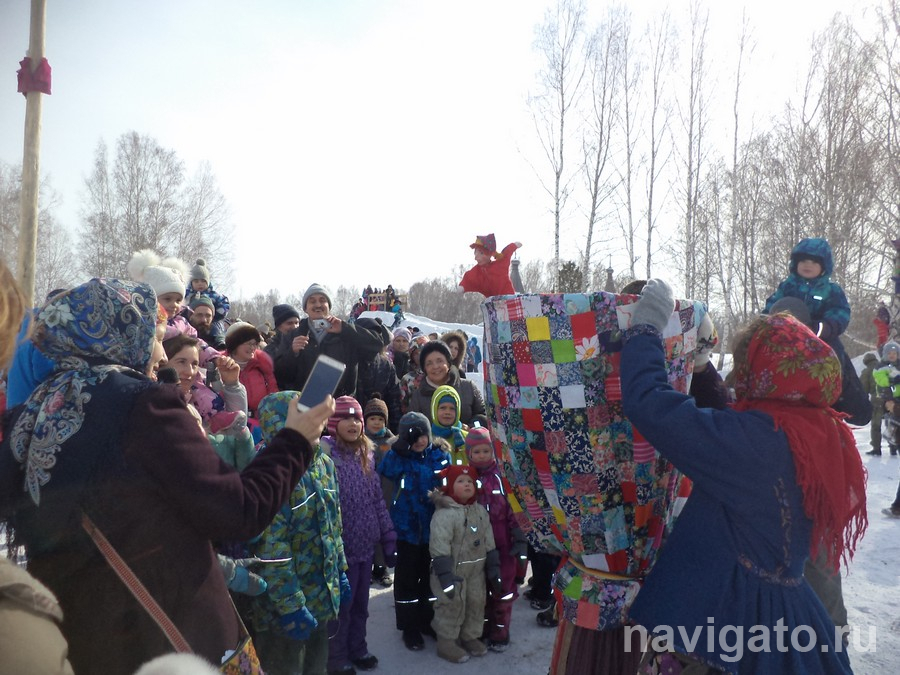 В этот день даже учёные забыли о серьёзности и деловом стиле. Вот, к примеру, один из организаторов празднования, сотрудник ИАЭТ СО РАН, кандидат исторических наук Ирина Сальникова в ярком павловопосадском платке несётся с ледяной годы, сопровождаемая шутками и игривыми взглядами коллег.